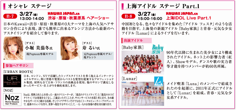 ステージ では、日本で人気の 姉ageha読者モデルコンテスト や、 ロリータ・アイドル・渋谷・原宿等日本の可愛い文化紹介のイベント も開催致します。また、熊本県オフィシャルキャラクター くまモングッズ も展開。一般来場者向けのイベントと景品が用意しますので、ぜひ会場へお越しください。また、最新の技術や美容機器の体験をいただき、楽しみながら新商品を発見してください。皆様のご来場お待ちしております。 |