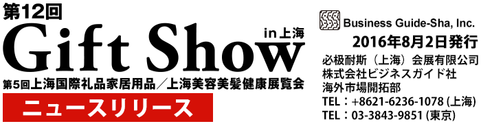株式会社ビジネスガイド社、必極耐斯(上海)会展有限公司は、8月2日(火)から4日(木)までの3日間、ここ上海世貿商城(上海マート)にて、「第12回Gift Show in上海、第5回上海国際礼品家居用品/美容美髪健康展覧会」を開催いたします。